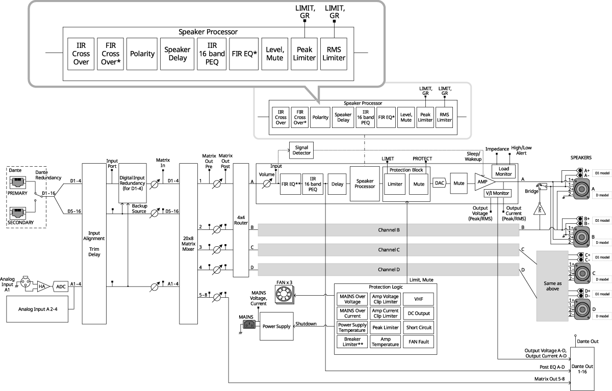 PC-D/DI 系列擴大機配備強大的板載(內建)喇叭處理器,可提供 16 頻 PEQ、延遲、峰值限制和 RMS 限制等處理,以及呈現線性相位的 FIR 濾波器**,讓使用者可完美、精確、輕鬆微調喇叭。Dante 輸出可將 Room EQ 的其他參數調整傳輸到其他擴大機,可集中調整多個擴大機聲道的 EQ。喇叭預設庫配備最佳化的 Yamaha CZR 系列和其他系列預設值,可輕鬆進行系統喇叭的完美微調。