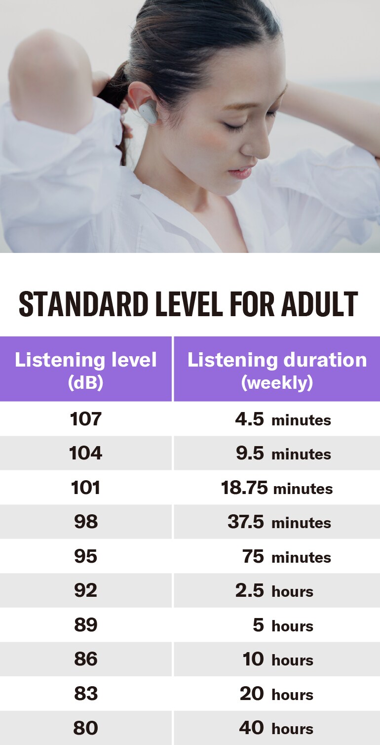 在思考聽力健康時,請同時考慮音量和聆聽時間。聆聽時間越長,音量應該越低。以下圖表可以作為參考,但不應被視為醫療建議。