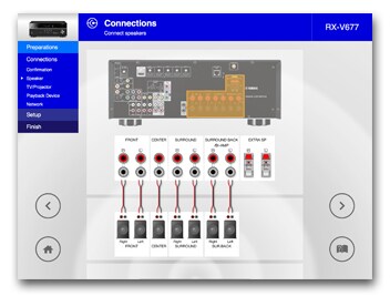 此應用程式可引導您完成如揚聲器連線、TV 和音源裝置連線以及分配功率擴大機等不同設定。