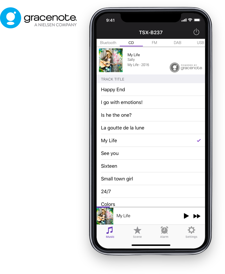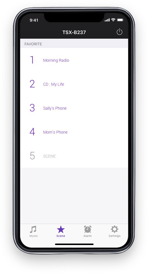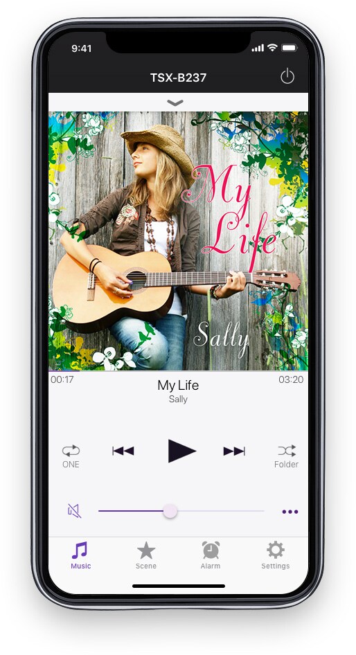 即使您不在 TSX-B237 旁邊,您也可使用自己的智慧型手機遙控 TSX-B237開機/關機、調整音量並選擇播放喜愛的樂曲。