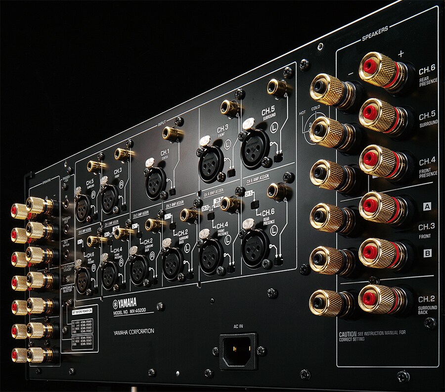MX-A52000 的後方採用高品質鍍金端子與 Y 插頭(鏟形連接器)相容,可與揚聲器進行最佳連線。