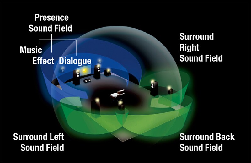 有了 CINEMA DSP 3D 的魔力,虛擬臨場揚聲器功能讓中置及環繞揚聲器創造出虛擬臨場效果。就算在安裝條件有限的情況下,也能體驗CINEMA DSP 3D 環繞音效。此擴大機也擁有後方環繞揚聲器功能,讓您可以在無後方環繞揚聲器的情況下,也能體驗來自後方的自然音調。多虧了 CINEMA DSP 3D,即使使用 5.1 聲道的配置也能呈現 9.1 聲道的環繞效果。
