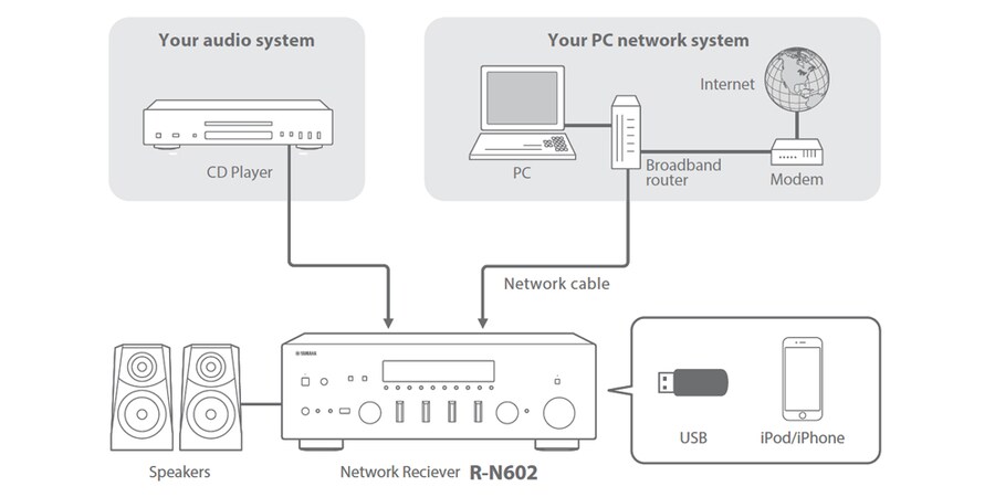 MusicCast透過高效能的無線網路功能傳送音訊,它可以從你的手機、電腦或NAS傳送數位音樂內容到家中任何MusicCast裝置,甚至可以分享連接上R-N602例如電視或藍光播放器的外部裝置。透過藍牙連接的智慧型手機或平板音訊內容,可以透過MusicCast傳送到不同的房間。