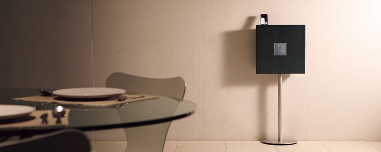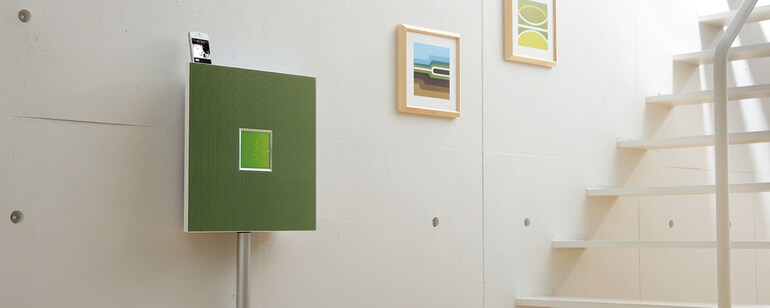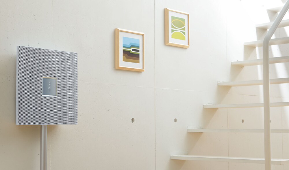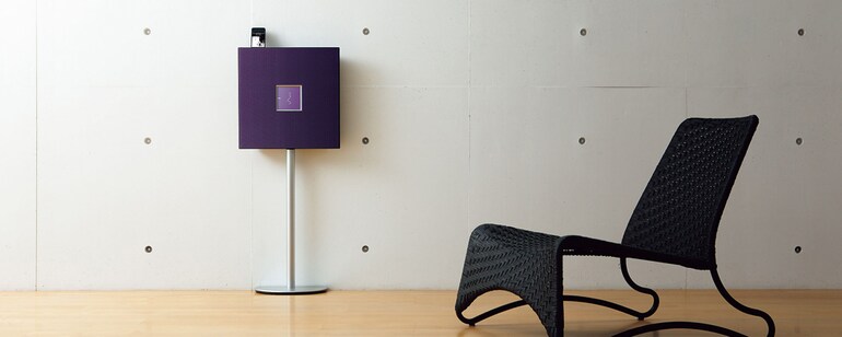其獨立的機身讓音樂成為室內設計的元素之一,由於兩側呈傾斜角度,因此看起來彷彿是一層薄薄的面板。前側的格柵使用會膨脹的金屬材質,讓人覺得表面紋路相當有吸引力。格柵下方的條紋圖案傳達出一種深度,給人音樂正是來自前側的印象。