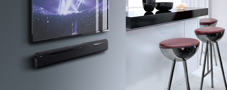 搭配圓弧形的外觀,美化你的家中空間。YAS-106可放置於架上或壁掛,取決於哪樣適合你家中的空間。此外,它會自動依據擺位而自動挑選適合的音場。
