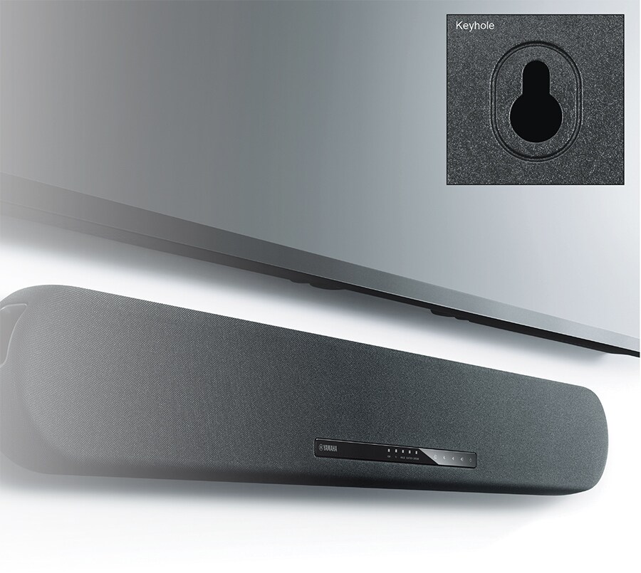 單件式劇院背後的安裝孔方便壁掛將音響安裝於牆上,內置陀螺儀可根據單件式劇院壁掛或平放的擺放方式來優化聲音。