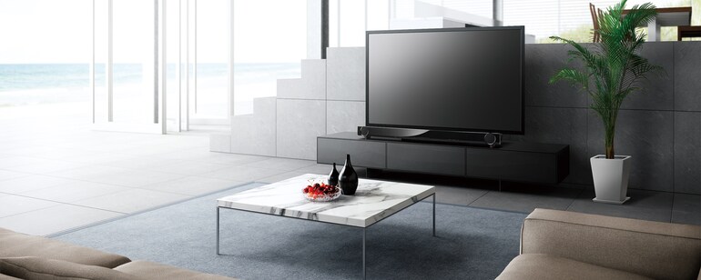 高度低可簡潔地放置於電視機前方。機身優美的弧形表面, 及亮面黑色烤漆搭配薄型電視, 為您的居家增添設計感。