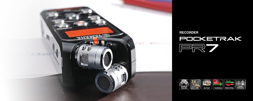 The POCKETRAK PR7 is Yamaha's newest, ultra-portable linear PCM recorder that provides effortless high-quality recordings whenever and wherever you need. Equipped with a newly developed crossed XY stereo microphone, the PR7 captures high-resolution stereo recordings, achieving consistent quality and natural sound. An invaluable tool for any musician, the PR7 offers essential practice functions such as an onboard tuner and metronome, as well as powerful recording functions like overdubbing and marker editing - all easily accessed via a simple, intuitive interface. It even features five optimized presets tailored to a variety of applications, so whether you're rehearsing, songwriting, attending a speaking engagement or making a field recording, achieving studio quality sound has never been so easy.