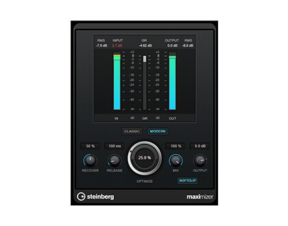 Maximizer 可提高音訊素材的響度,而無削波的風險。本外掛程式提供經典和現代兩種模式,分別提供不同的演算法和參數。