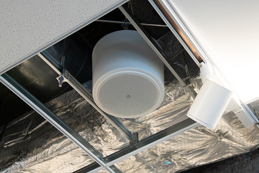 Open Innovation Space ADECIA 音箱和麥克風安裝在天花板上。