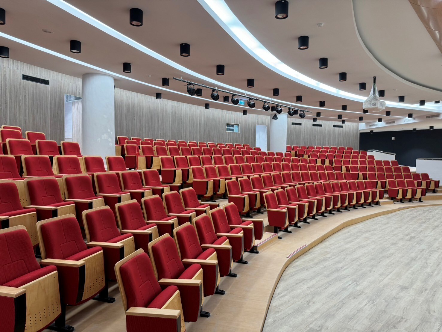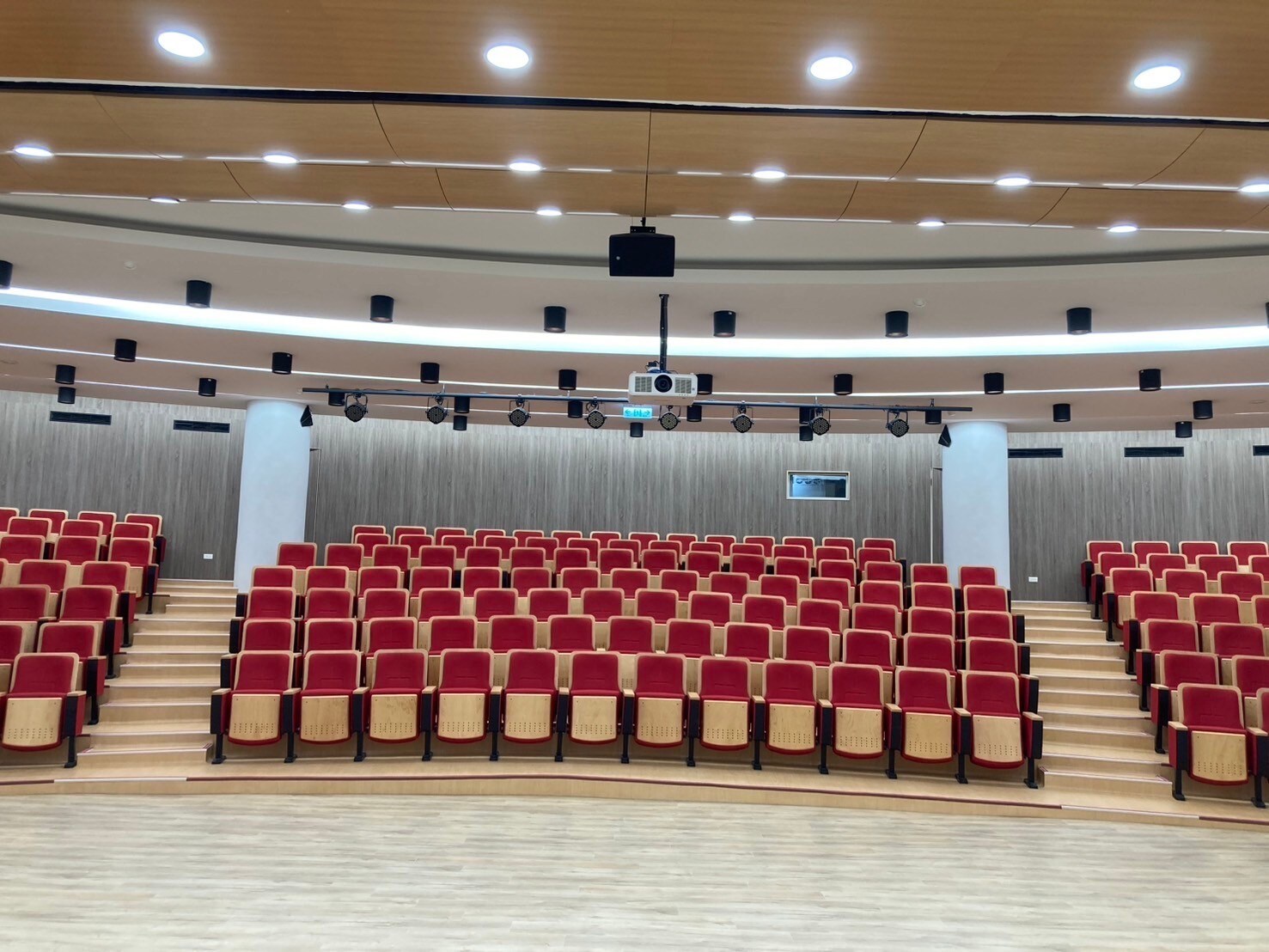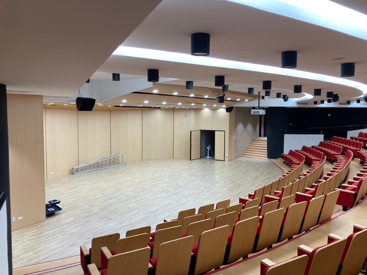 主音響系統採用 NEXO P12 點音源被動式喇叭,經過精心配置,確保音樂廳內聲音覆蓋均勻且高保真。舞台監聽則選用 Yamaha VXS8 輔助喇叭,為舞台上的演出者提供乾淨且清晰的聲音。
