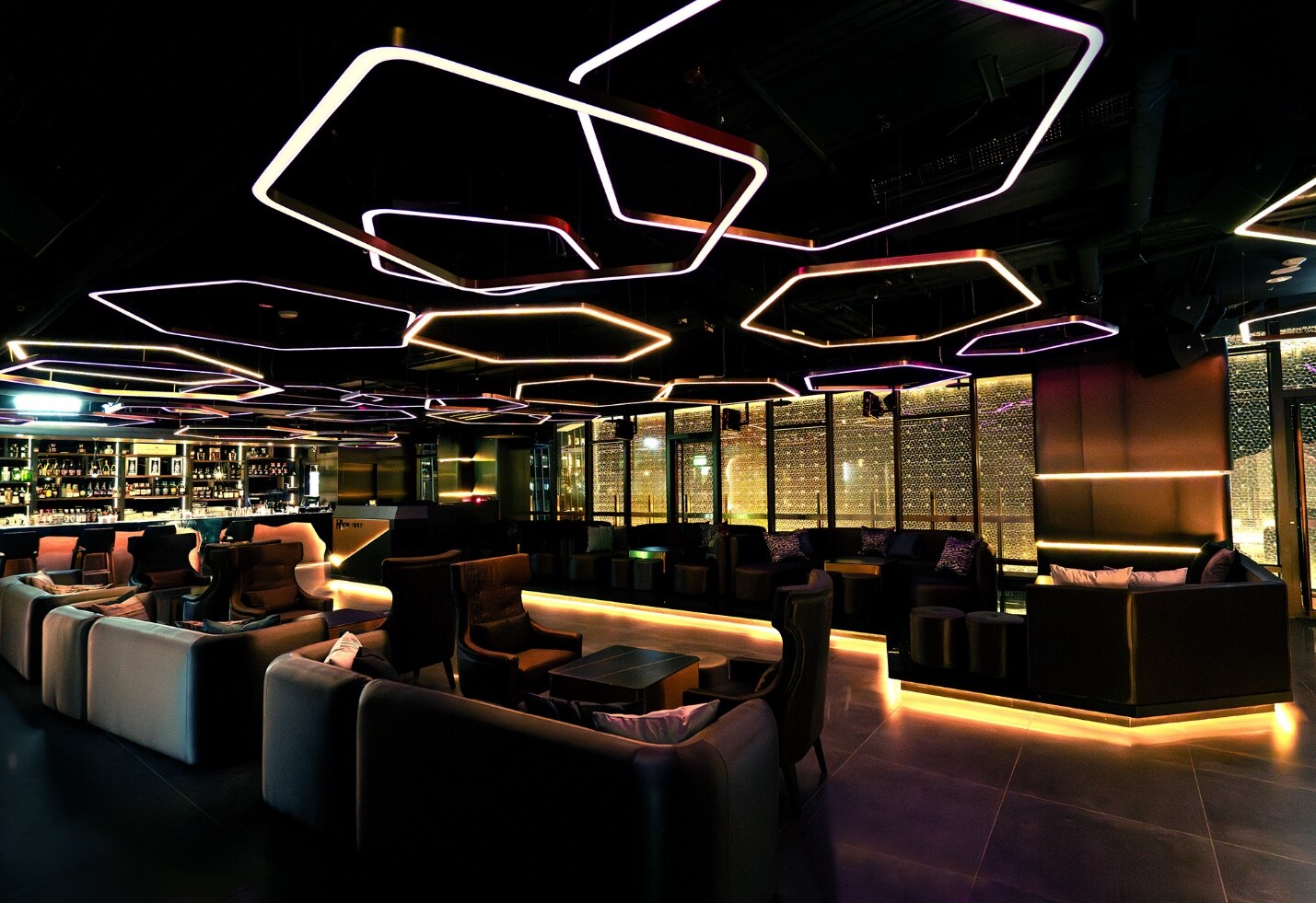 入夜後開放的包廂區可容納4至12人不等,皆有落地玻璃窗180度環繞,有著眺望101大樓煙火的最佳景觀位置,每個夜晚皆有知名DJ不間斷的音樂放送。除沙發座位,ONE RULE也設有可容納12至15人的私人VIP包廂。