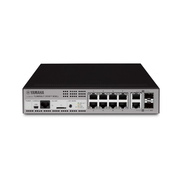SWR2311P-10G 是一款智慧型 L2 交換機,可為 PoE 動力設備在網路上提供動力。Yamaha 已整合其自身的網路及專業音訊領域的專門知識,並開發出專為 Dante 音訊網路最佳化的 L2 交換機。