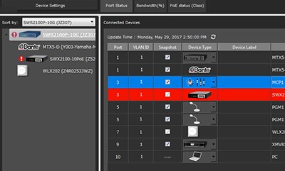 僅透過 IP 或 MAC 位址識別連接到交換器裝置,是困難且容易出錯的方式。已連接的 Dante 裝置可由 Dante 圖示以及之前透過 Dante Controller 軟體所設定的裝置 ID 識別。您還可以在 [標籤] 和 [註解] 欄位中輸入其他訊息,例如裝置的位置。