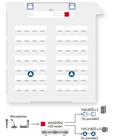 本系統適合於在教室中使用。MA2030以4Ω的模式以一個通道驅動兩顆並聯的VS6壁掛安裝喇叭(每個8Ω),另一通道用於驅動兩個並聯的VXC4吸頂喇叭(每個8Ω)。