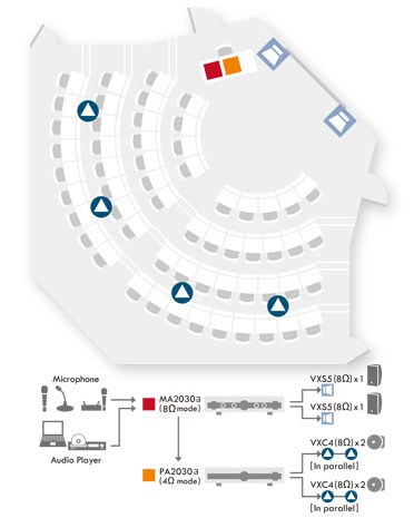 這系統適用於演講廳、會議室使用。MA2030和PA2030在4Ω模式下使用,分別驅動一對VXS5壁掛安裝喇叭(每個8Ω)和四個VXC4吸頂喇叭(每個8Ω)。多支麥克風可以連接到MA2030,房間內整體的輸出音量可以由前面板音量旋鈕方便的控制。