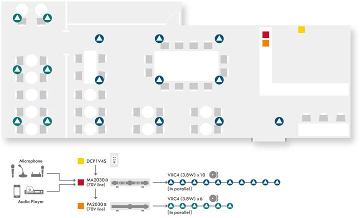 此圖片顯示了一個理想的帶酒吧和露台的餐廳系統。MA2120被設置以驅動100伏特的線路,推動總共8支變壓器切換成3.8W的VXS3FT壁掛喇叭,以及4 支VXC3F吸頂喇叭。MA2120可以在各別區域中以不同的音量提供不同的音源。在4Ω模式低阻抗連接PA2030驅動總共4支並聯的VXS5壁掛安裝喇叭,以更高的音量提供相同的BGM內容。