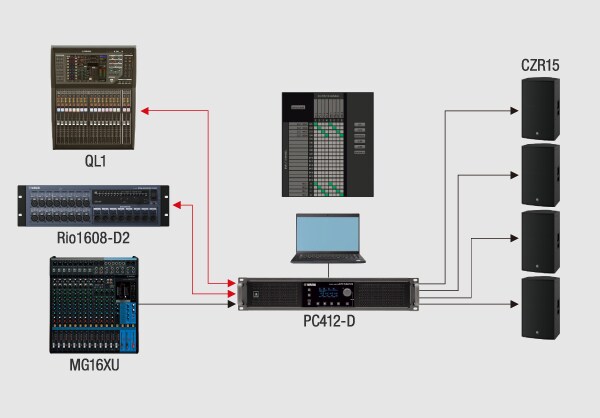音訊從兩台裝置的 Dante 輸入饋送至 PC412-DI。輸入矩陣功能將整合音訊引導至喇叭。此外,Dante Out 可將調整後的 EQ 音訊傳送到其他擴大機。