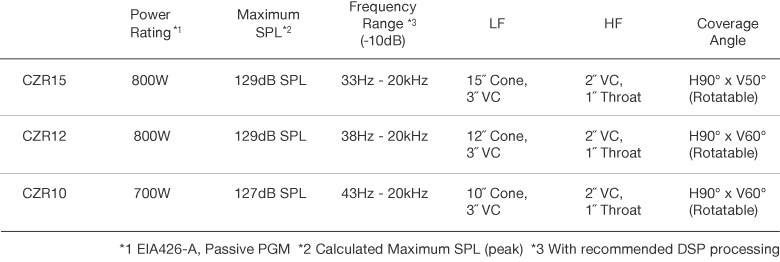CZR15 和 CZR12 皆可產生 129dB SPL,被動模式下 CZR15 和 CZR12 的額定功率為 800W,CZR10 的額定功率為 700W。每個 CZR 型號還配備 Biamp 模式,可以最大幅度提高性能。