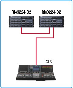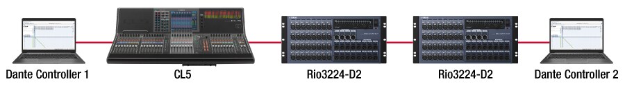 CL、QL、R 系列的 Dante 模組和其他有內建交換器的裝置可進行菊鏈連接。雖然裝置實際為菊鏈連接,但邏輯網路拓樸為星型。