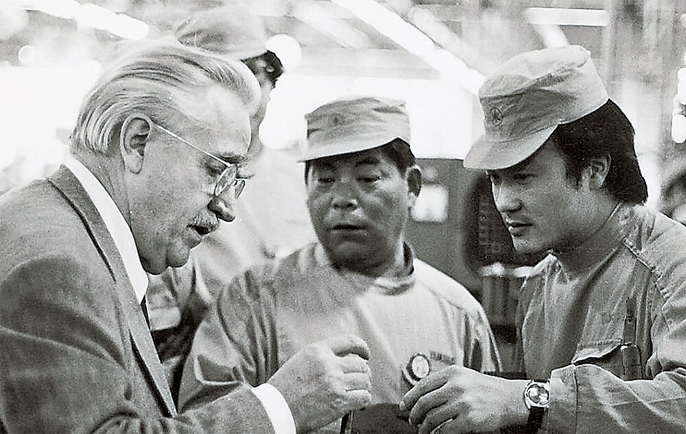 Schilke 在豐岡工廠進行品質檢查,而 Kawasaki(右)則在旁關注(1970 年)