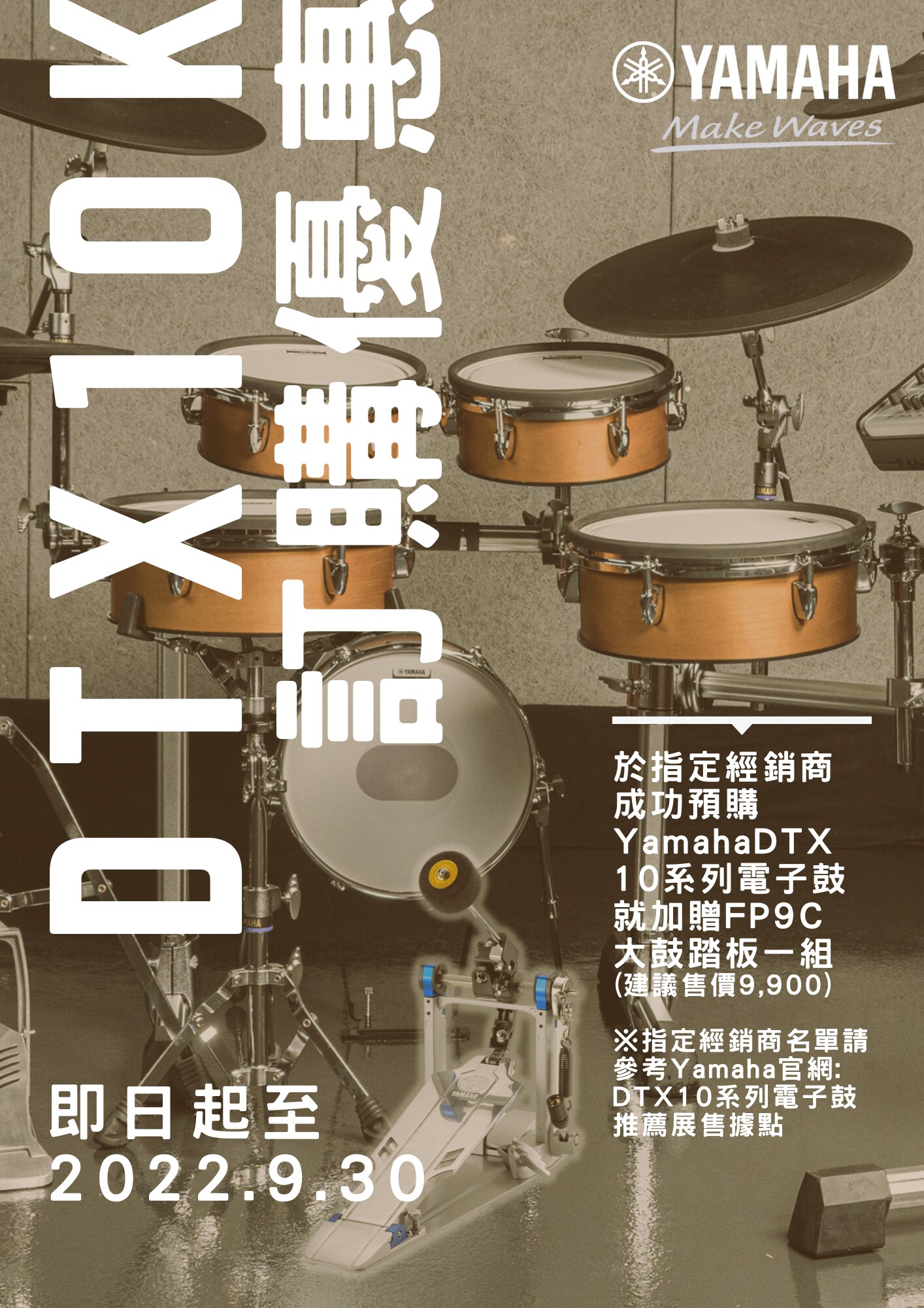 即日起至2022年9月30日止,於指定經銷商成功預購Yamaha DTX10系列電子鼓,就贈送Yamaha FP9C大鼓踏板一組。(FP9C踏板建議售價9,900元,隨電子鼓本體出貨。)
