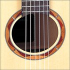 響孔飾以原創的桃花心木、紅木和鮑魚貝鑲嵌裝飾設計。NCX 系列採用圓孔形狀(左),而 NTX 系列採用橢圓形(右)。