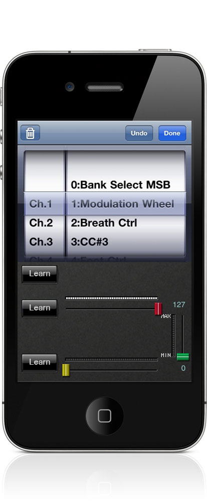 - 學習模式下由外接MIDI裝置接收MIDI訊號並且自動分配參數