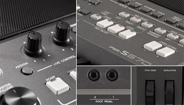 PSR-S670擁有兩個即時操控旋鈕、一個效果轉輪、與兩個腳踏板接孔,讓你可以完整操控所有音色、伴奏、效果、與現場表演中所需的所有功能。