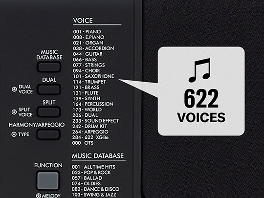 PSR-E310 有著 Yamaha 新開發的音調產生器 LSI,可帶來高品質的驚人聲音表現。得益於這一新款 LSI,您可盡情享有著 622 種樂器聲音且內容全面的音樂庫,以完美表現您喜愛的各式樂風。獨一無二的超清晰 Lite 音色,讓您得以再現諸如大提琴與曼陀鈴等弦樂器的顫音及振動音,驚人的真實音色,為您帶來一流的頂級演出。