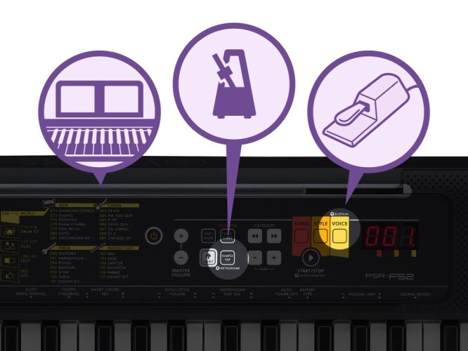 PSR-F52 是希望學習彈奏的初學者的完美鍵盤樂器。擁有您第一次彈奏樂器所需的所有功能。動手嘗試使用全球知名樂器商 Yamaha 製造的電子琴,您會發現這是一個絕佳的音樂創作器材。PSR-F52 為想要開始彈奏鍵盤樂器的初學者,提供堅實的基礎。