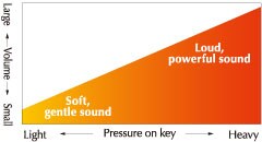 透過改變觸鍵的方式,演奏者能夠自由的表現出彈奏的音量、琴音的強弱表現以及音調的柔和與明亮等地細微變化。