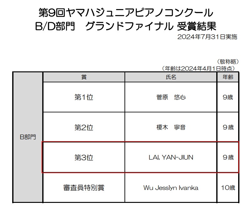 《少年組總決賽得獎名單》轉自日本官網