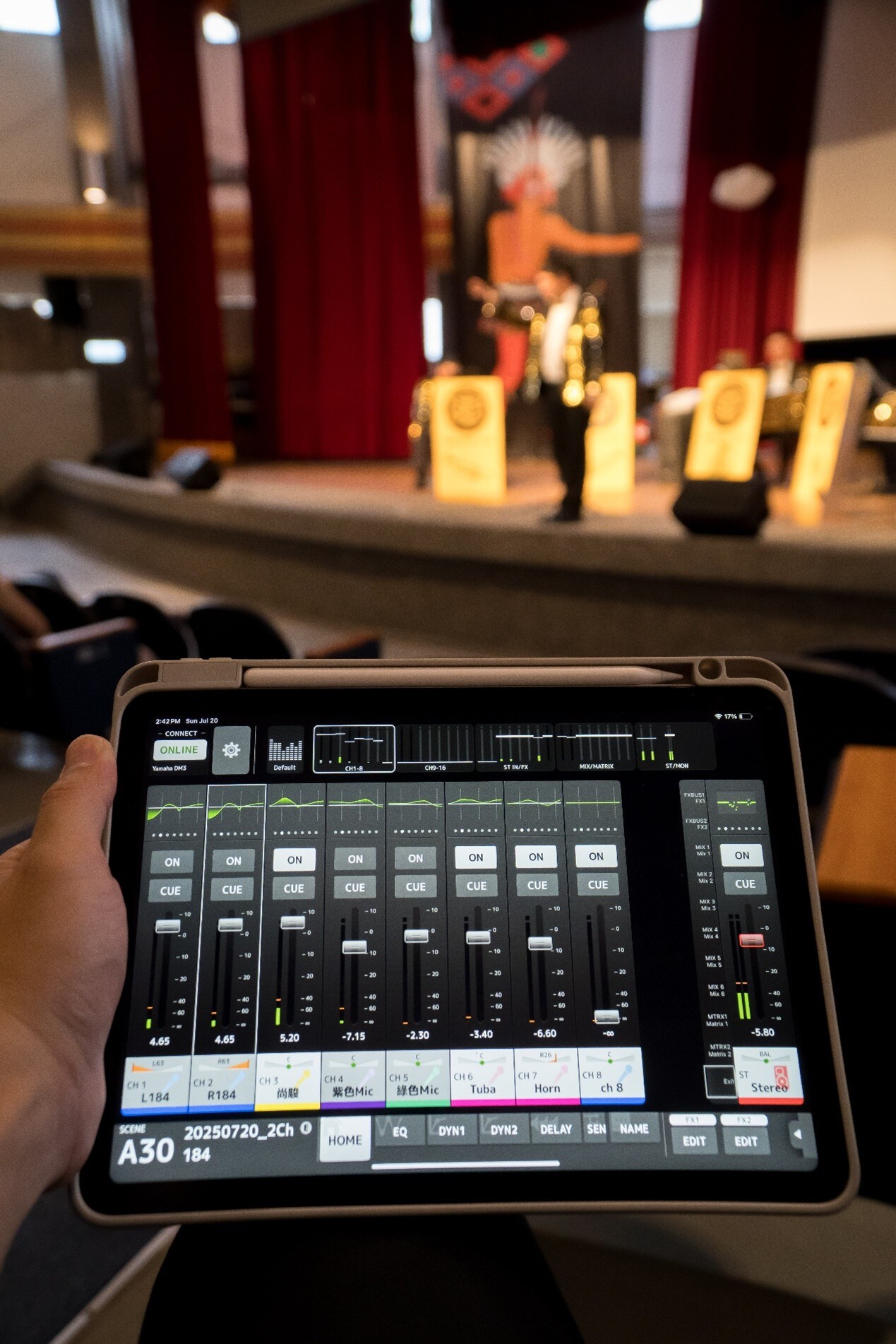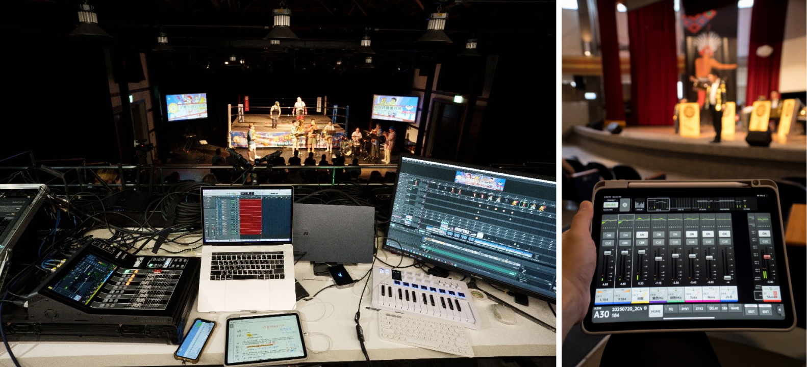 技術團員陳聖桓解釋選擇DM3的關鍵原因:「我們發現專業音響廠商也使用網路設備,覺得非常方便。DM3不僅大幅節省架設時間,更重要的是它讓每位樂手都能透過手機APP調整自己的監聽比例,這對小型演出團體來說是革命性的改變,同時提升效率與降低技術人員現場負擔。」