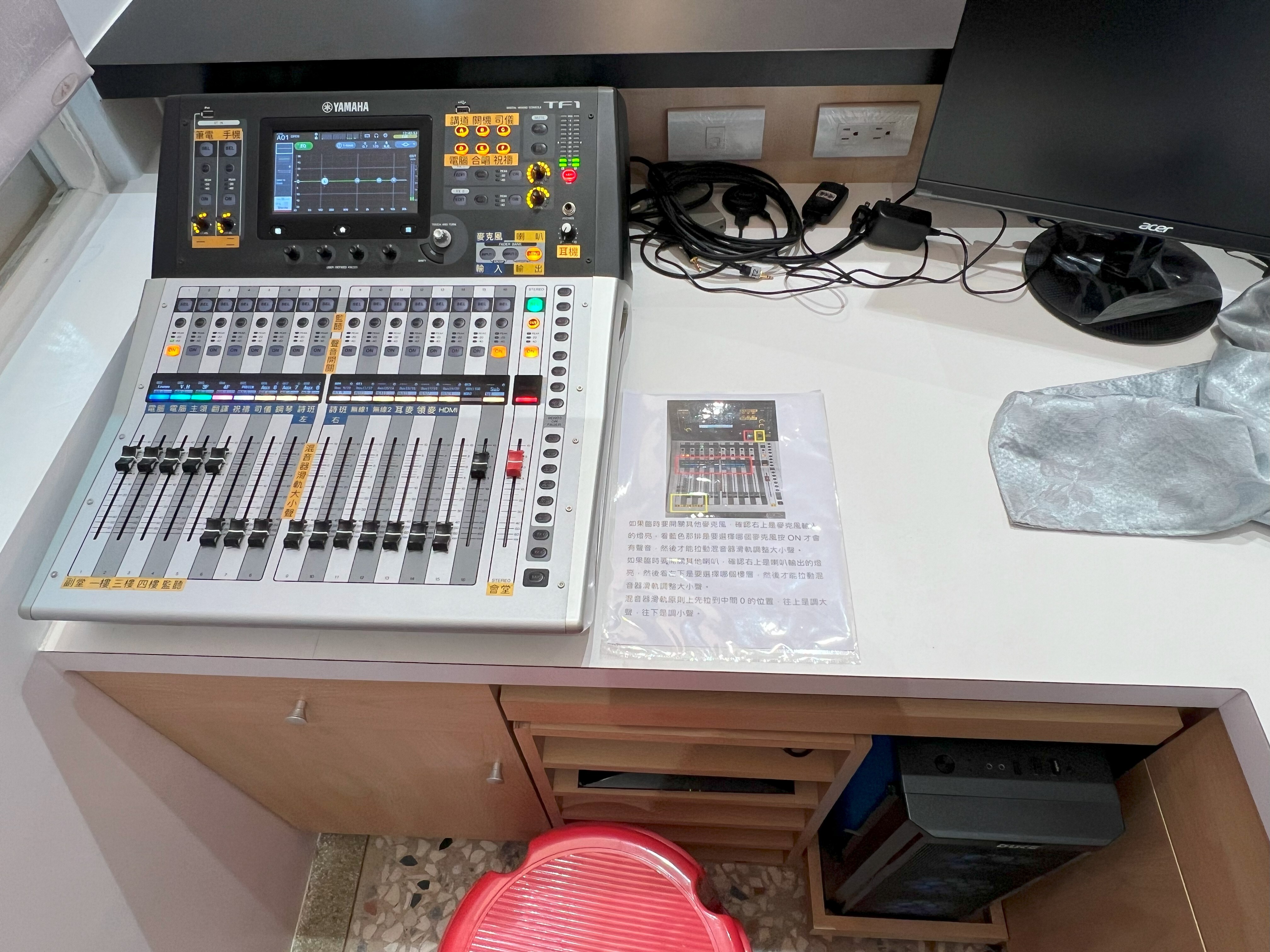 針對主堂的需求,系統設計團隊以 Yamaha TF1 數位混音器 搭配 PX5 擴大機 作為核心。TF1 以直覺化的操作介面聞名,觸控式螢幕結合推桿設計,使音控人員即使非專業工程師,也能快速上手。透過內建的場景記憶功能,教會可依據不同活動事先設定專屬音場,例如「主日講道」、「詩歌敬拜」、「婚禮模式」或「影片播放模式」,並於活動時快速切換,節省調整時間。