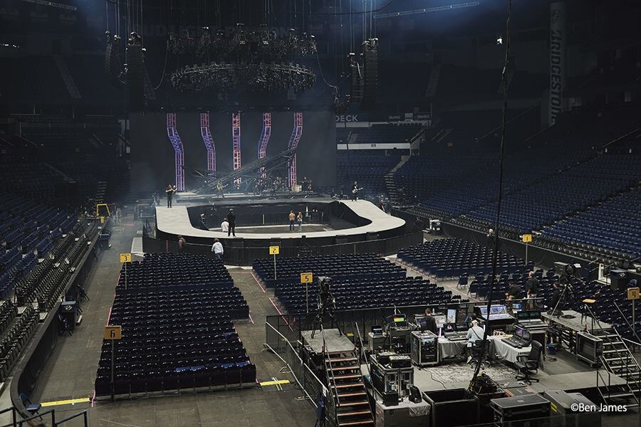 這次巡迴演出導入一種特別複雜的舞台設計:一個馬蹄形的延伸舞台,讓舞台被觀眾席環繞。可以營造出緊密的表演氛圍,但也帶來了嚴峻的音響挑戰。「這些對話早在幾個月前就開始了,」洛伊回憶道。「我們真切想弄清楚如何讓演出最重要的音源,也就是人聲聽起來乾淨清晰,而無需使用大量的 PSE [Primary Source Enhancer] 產品,也不必過度增強以至於高頻部分完全消失。」