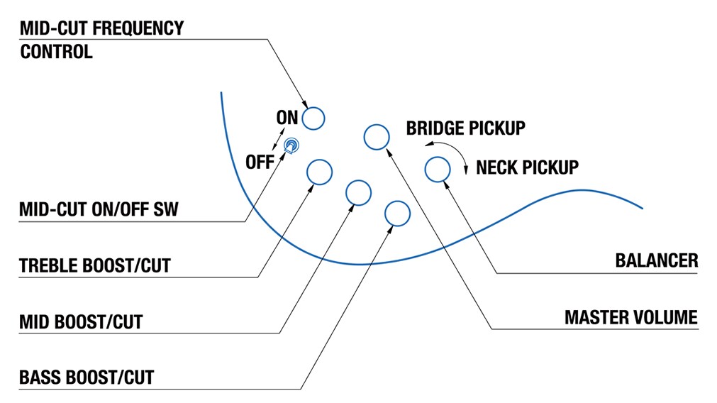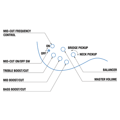 | 控制器 | Master Volume, P.U. Balancer, 3-Band EQ(Bass, Middle, Treble), Mid Cut Frequency Controls, Mid Cut On/Off Switch | |
