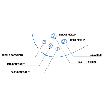 Master Volume, Pickup Balancer, 3-Band EQ(Bass, Middle, Treble) |