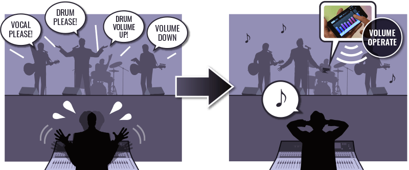 每個控制台最多可以連接十個MonitorMix應用程式,它們讓舞台上的演奏者可以獨立控制各自監視器級別。